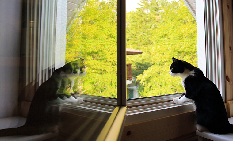 開けた窓ガラスにピノが写っているのが面白くて撮影してみました。